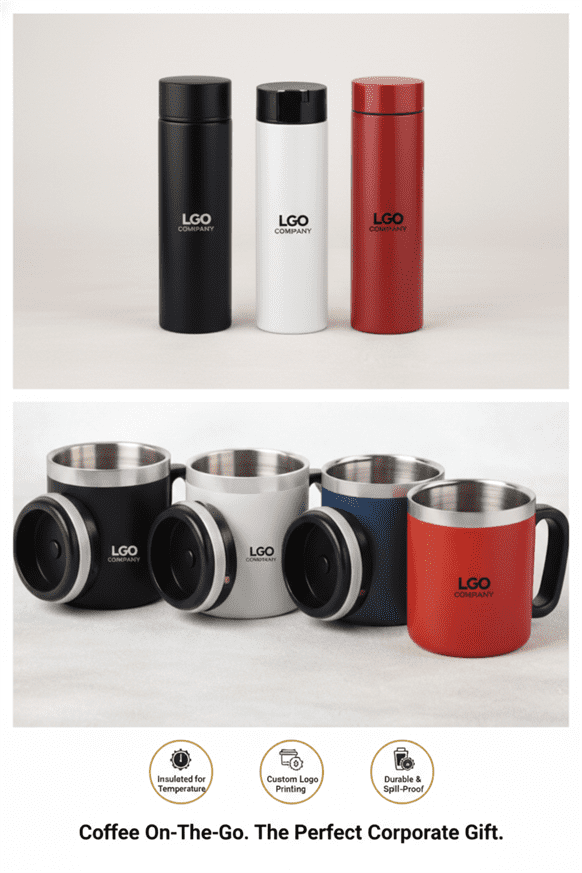 Stylish tumblers and mugs designed for everyday use at home or office. A perfect blend of practicality and branding.