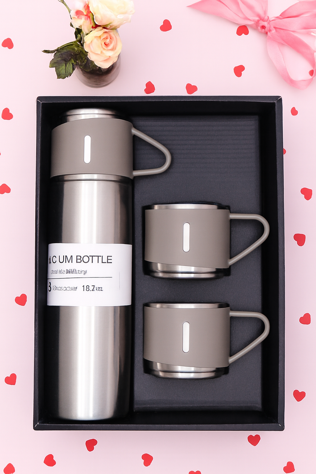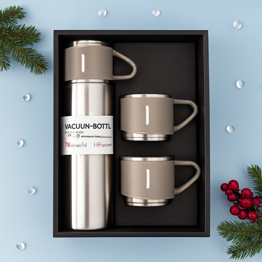 A vacuum bottle and cups set typically features a double-walled stainless steel flask with vacuum insulation, paired with 2-3 matching stainless steel cups. It keeps beverages hot for 6-12 hours or cold for up to 12 hours, ideal for travel, office use, or gifting, with capacities around 500ml for the flask and 200ml per cup.